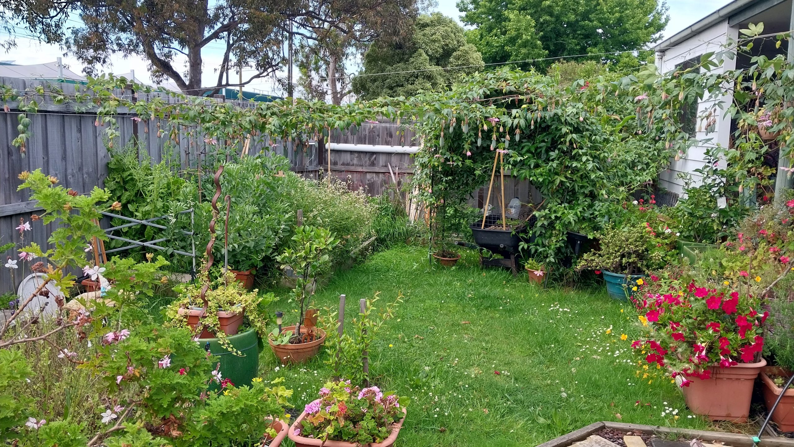 Playing Bad Manners rude boy ska music on the BT speaker, looking around how much of the garden and veranda we’ve put to rights – and liking how much better it all looks, and how many of the vegetables are producing already, the Secret Grotto garden beside the entry gate. Oh and watching a 9kg cat trying to use a too-small plant pot as his long drop dunny . . . That earned an embarrassing Coke spit and eventual laughter.